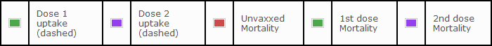 Vaccine Uptake % and All Cause Mortality Rates x 105, for Ages 70-79